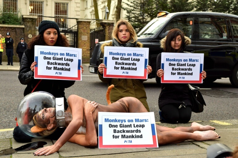 Представители организации устроили пикет против жестокого и неэтичного, по их мнению, обращения с животными. Главным событием акции стало появление Саманты Бентли, которая сыграла в трех сериях знаменитого сериала "Игра престолов". Она протестовала в обнаженном виде, лежа в луже искусственной крови и прикрывшись плакатом с лозунгом "Обезьяны на Марсе: большой шаг назад для всего человечества". Кроме того, актриса загримировалась под обезьяну.